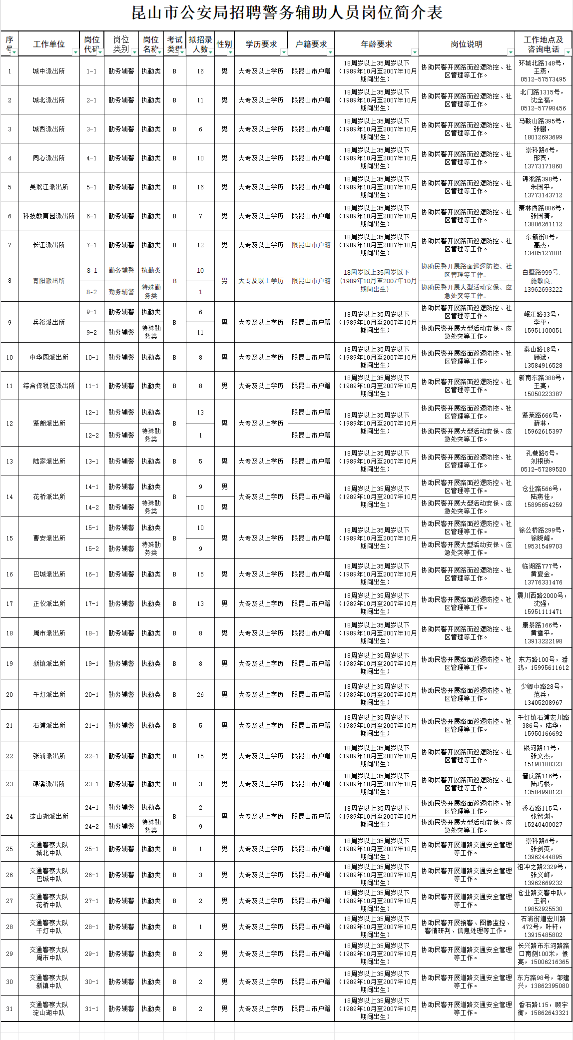本次招聘岗位、人数及相关条件详见《昆山市公安局招聘警务辅助人员岗位简介表》(附件1)。