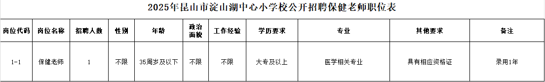 附件1:2025年昆山市淀山湖中心小学公开招聘保健老师职位表