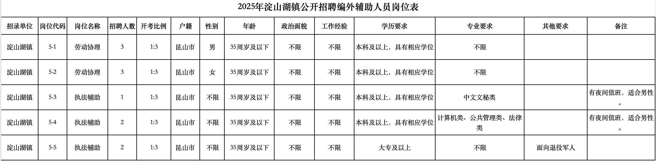 招聘岗位及条件等详见《2025年淀山湖镇公开招聘编外辅助人员岗位表》(附件1)。