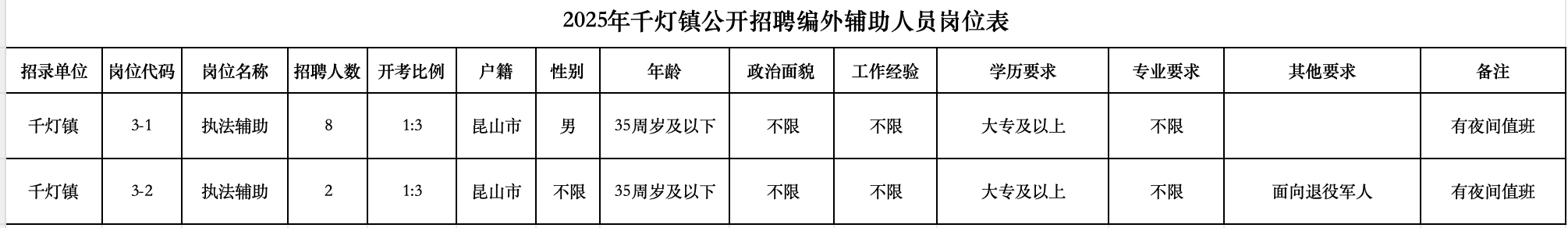 招聘岗位及条件等详见《2025年千灯镇公开招聘编外辅助人员岗位表》(附件1)。