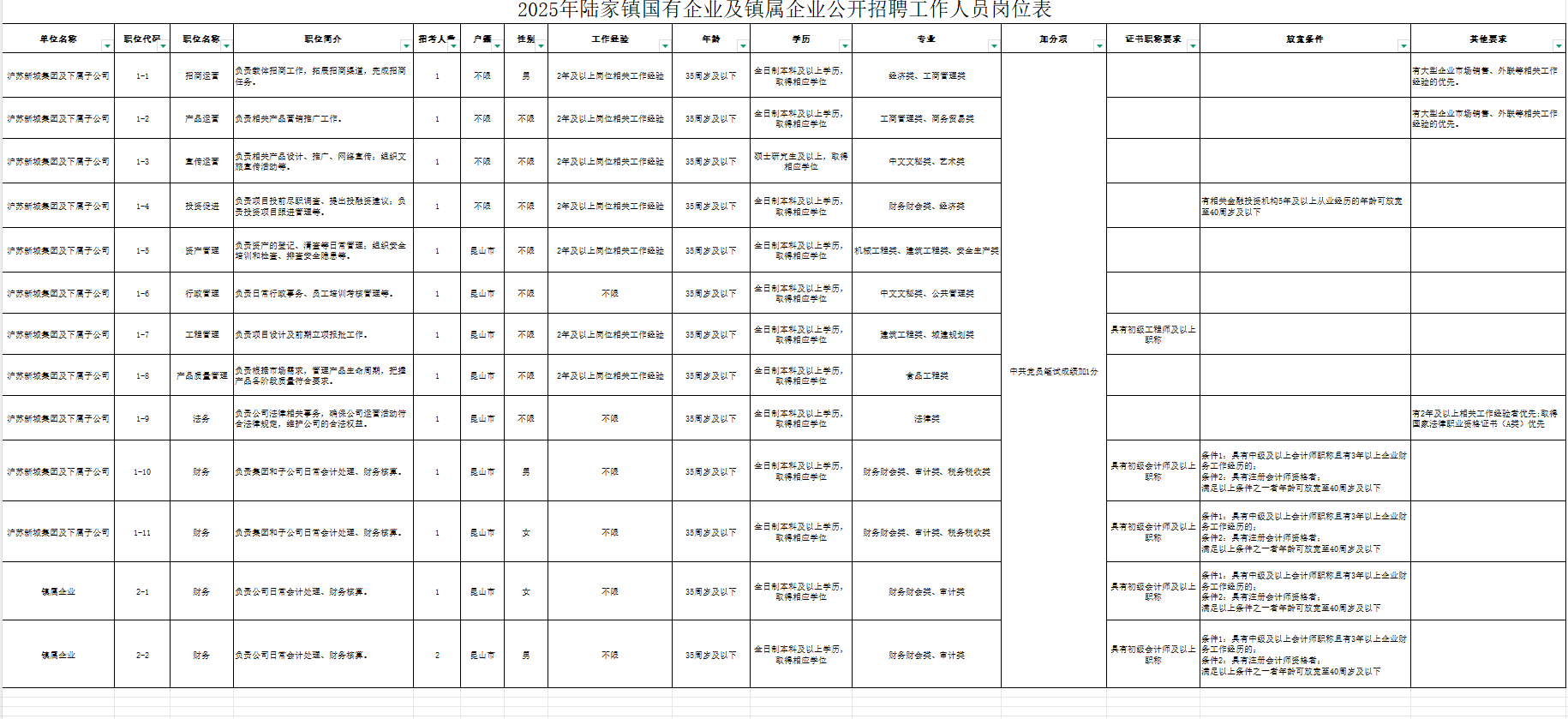 招聘岗位及条件等详见《2025年陆家镇国有企业及镇属企业公开招聘工作人员岗位表》(附件1)。