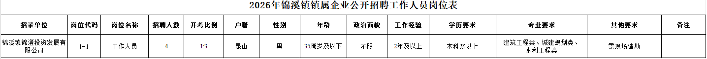 招聘岗位及条件等详见《2026年锦溪镇镇属企业公开招聘工作人员岗位表》(附件1)。