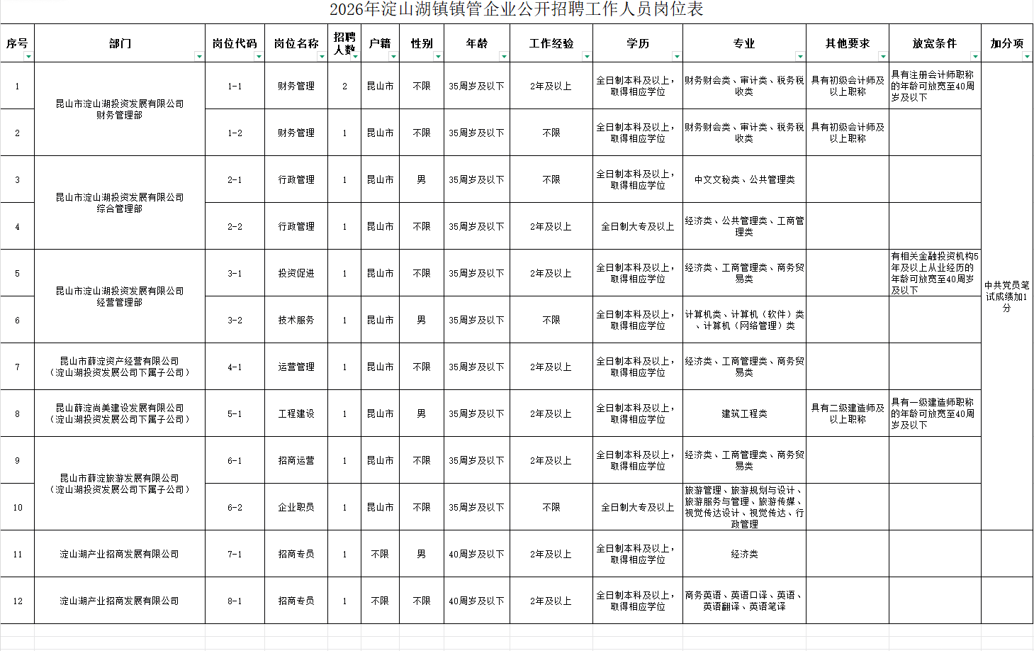 招聘岗位及条件等详见《2026年淀山湖镇镇管企业公开招聘工作人员岗位表》(附件1)。